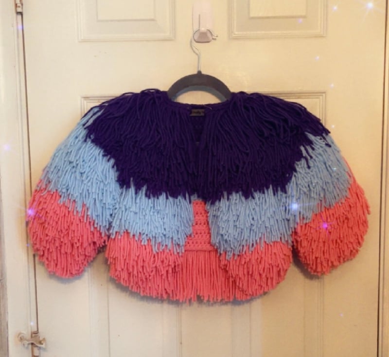 Handmade crocheted sweater with full fringe. Includes matching headband or leg warmers. Made to order with up to any 4 colors.